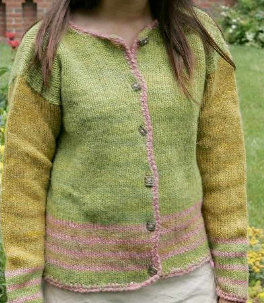 It’s a coat, it’s a shirt, it’s SUPER sweet! Just plain Jane in one SEACOLORS variegated dyelot, this can be finished with crochet contrast or piping trim. Color blocked, or in a striped pattern, the seaglass, beachstone or vintage buttons make this a summer jacket you can wear all year without wearing out its welcome. A Cardigan knit from the bottom up in 5 pieces with optional striping.