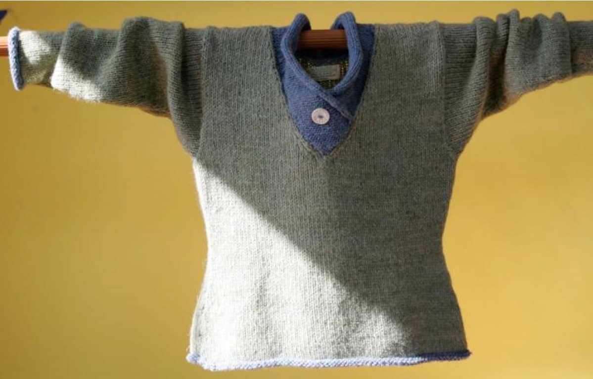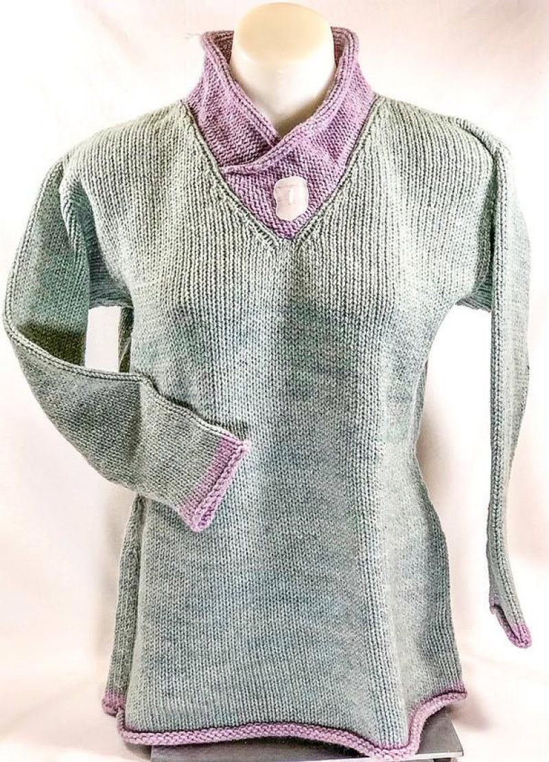 Emma Snodgrass created a sensation in 1852 by showing up in Boston wearing pants. This V-neck contemporary top highlights the beautiful solar dyed yarn colors from Maine. Options for making longer or shorter. Pop in some color for stripes or accent finish.